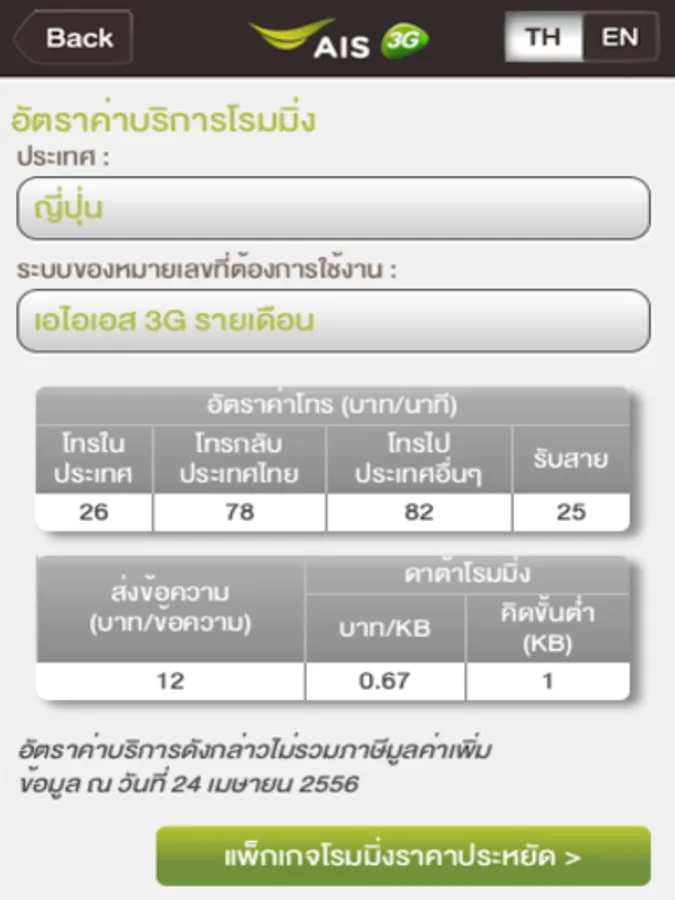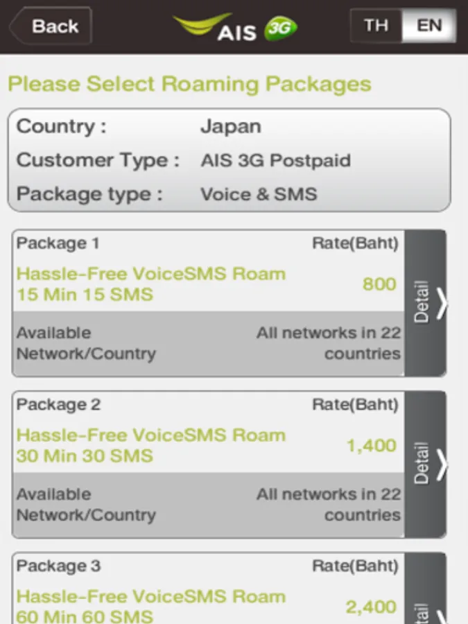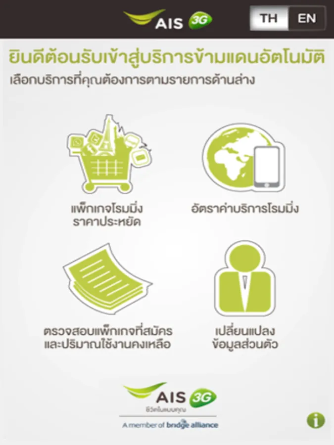 AIS Roaming is an International Roaming Application from AIS that brings you the convenience of subscribing to AIS Data Roaming packages yourself, anytime, anywhere in the world. Data usage while overseas is now convenient and saves money too, whether you want to use the internet, email, chat or other data applications. The AIS International Roaming Application offers you the following 3 services: