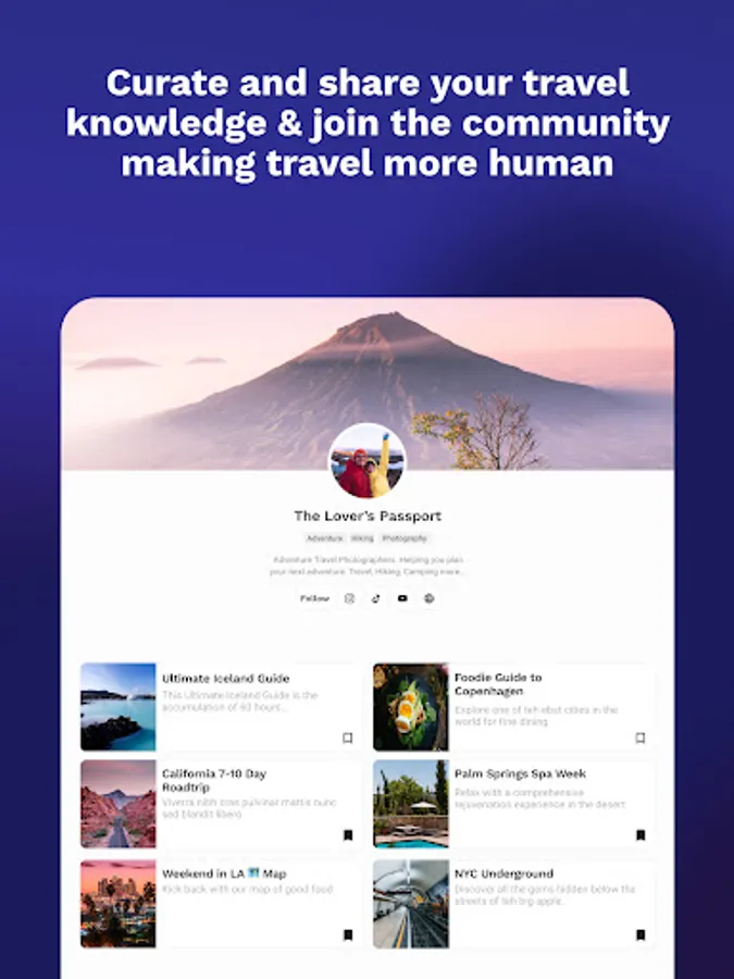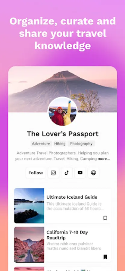 Browse interactive travel guides and maps curated by expert travel creators • Find a creator to plan your next trip • Organize your trip all in one space • Save hours of research • Use guides on the go • Combine information from multiple creators • Build your own living map with all the spots you’ve gathered