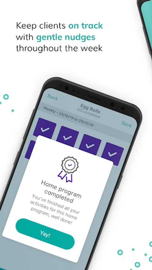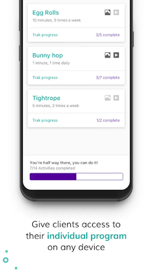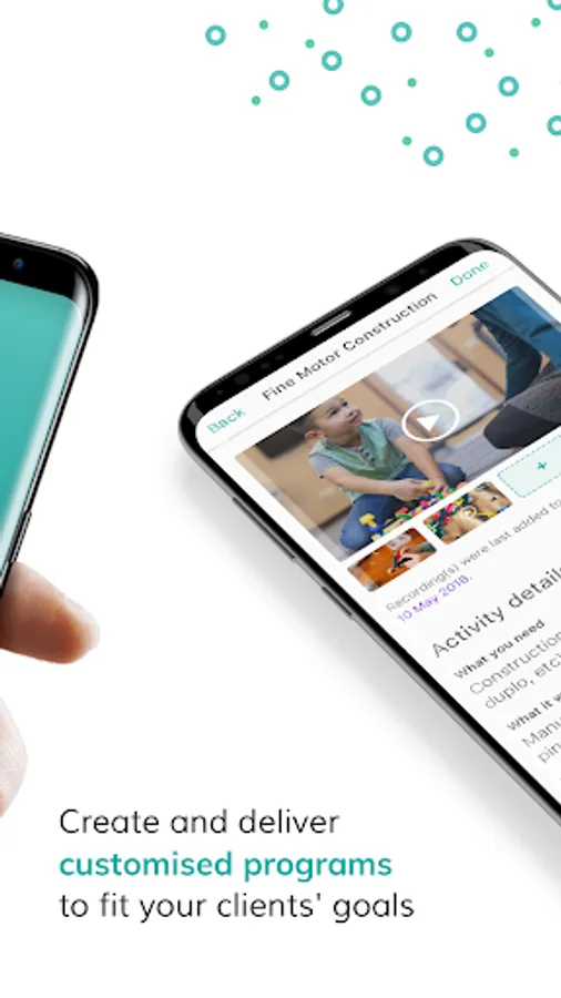 Therapists have access to a database of therapeutic activity scaffolds which they can easily access within a therapy session. Therapists then attach photos and videos to create highly personal home programs, individual to each client’s needs. This allows the therapist to grade the activities to the child’s abilities and give specific verbal and written notes about task completion.