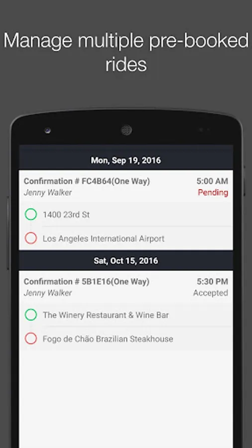 Pre-book one-way or hourly trips up to 30 days out. You can book for yourself or another passenger.