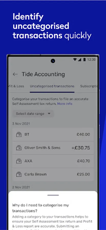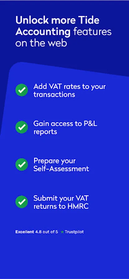 You don't need a bank account with Tide to access the platform. Simply download this app and connect your existing account to access our smart features. For more accounting features, you can access them by logging onto our desktop version. If you’re an existing member, log into your Tide account and click ‘more’ to sign up for Tide Accounting.