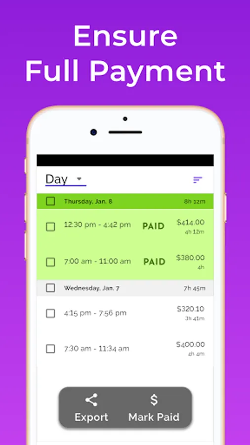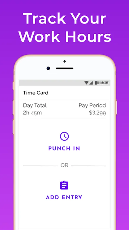 • Stay organized by keeping track of work hours and seeing reports by pay period, week or month