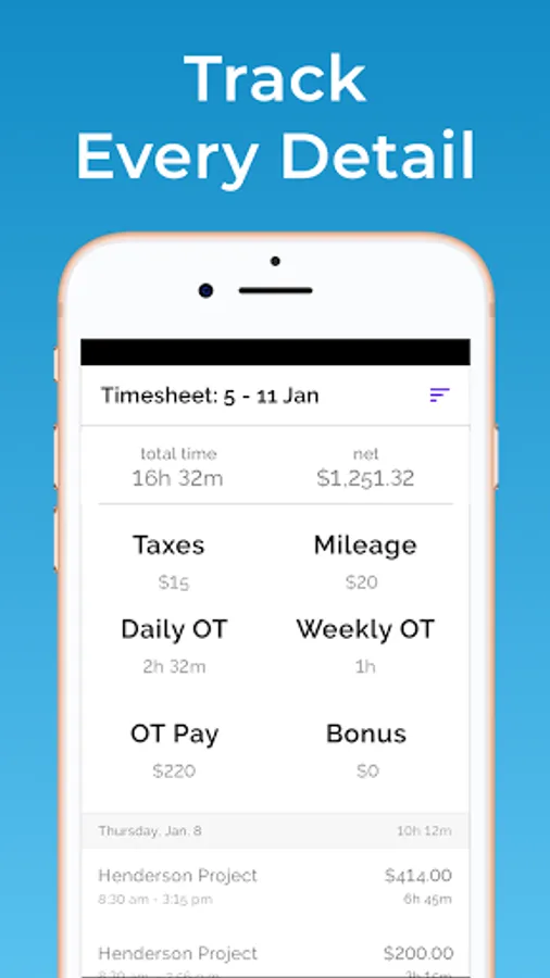 Daily and weekly overtime work hours and rates are tracked and applied automatically. Set up when overtime kicks in via the settings.