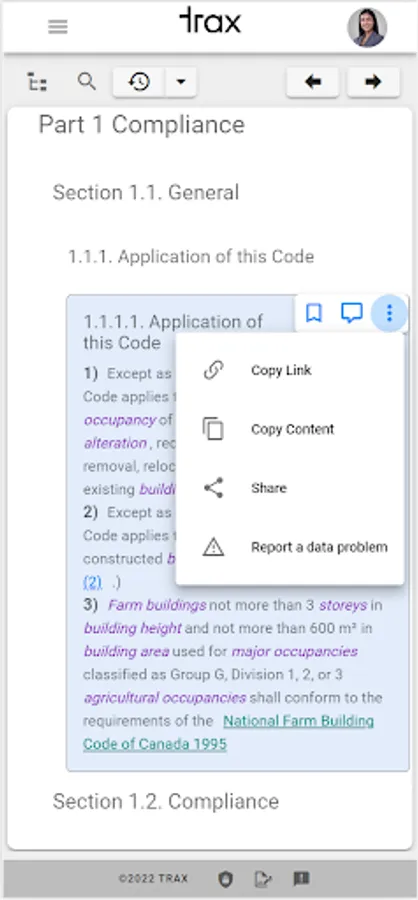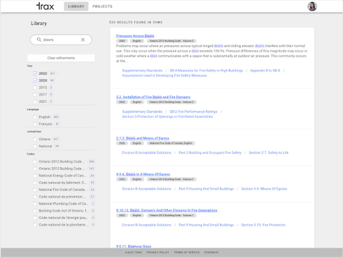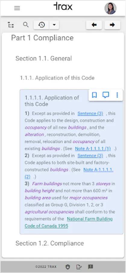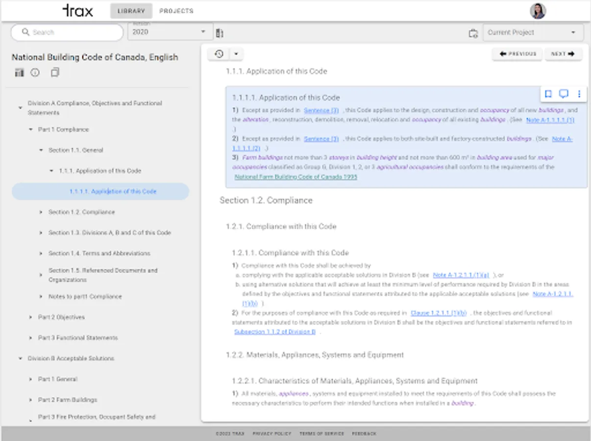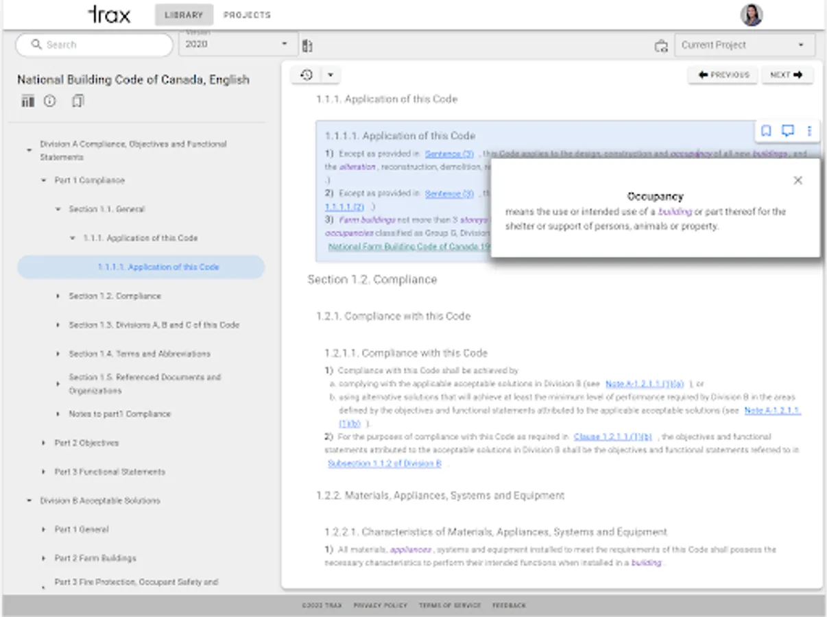 At Trax, our vision is to transform, digitize and modernize the building code user experience for AEC professionals by providing the Provincial and National Building Codes of Canada through an intelligent app that is easy to navigate, always up-to-date, and is available anywhere at anytime! Trax provides building practitioners with a streamlined, efficient and easy way to access to codes. The improved user experience will result in increased productivity and time saving for AEC professionals. We want to make building codes accessible to everyone.