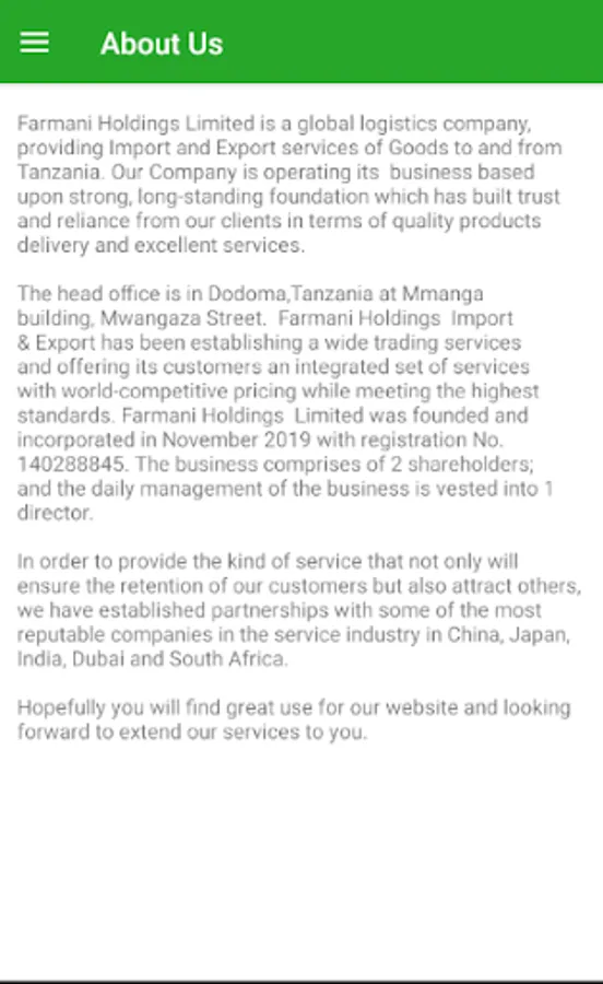 Farmani Holdings Limited is a global logistics company, providing Import and Export services of Goods to and from Tanzania. Our Company is operating its business based upon strong, long-standing foundation which has built trust and reliance from our clients in terms of quality products delivery and excellent services.