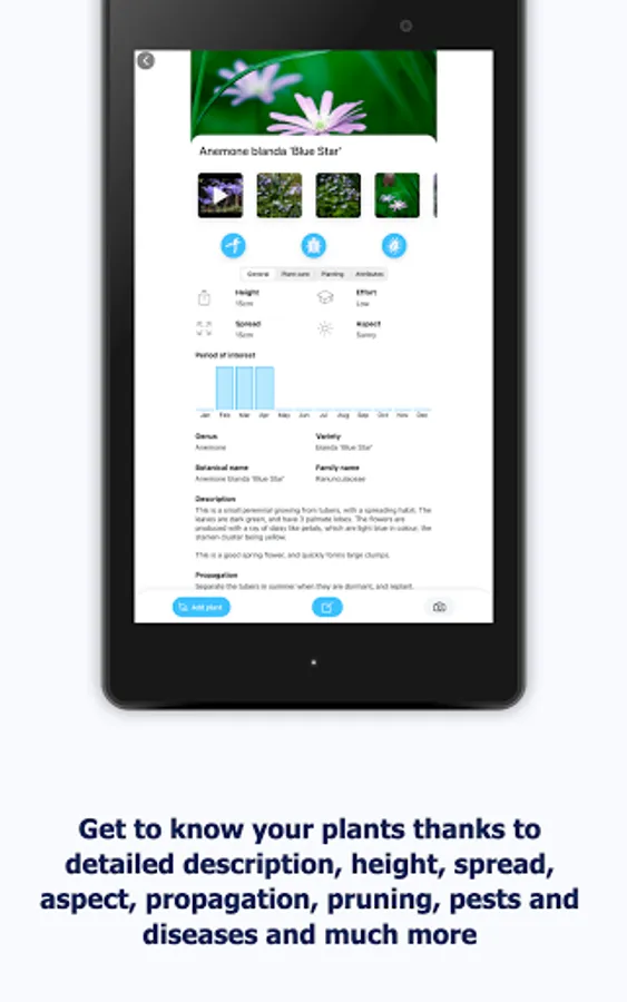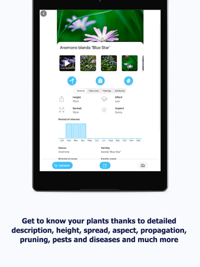 - Get to know your plants thanks to detailed plant description, height, spread, aspect, Botanical name, Botanical name explanation, genus and much more