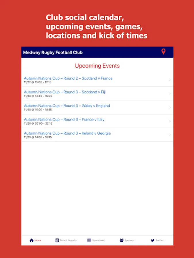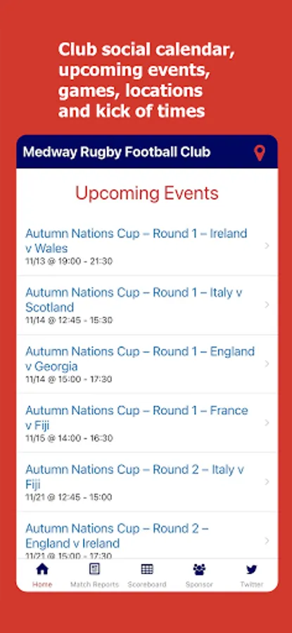 - Home page: Link to Club social calendar, scheduling all upcoming events, games, locations and kick of times