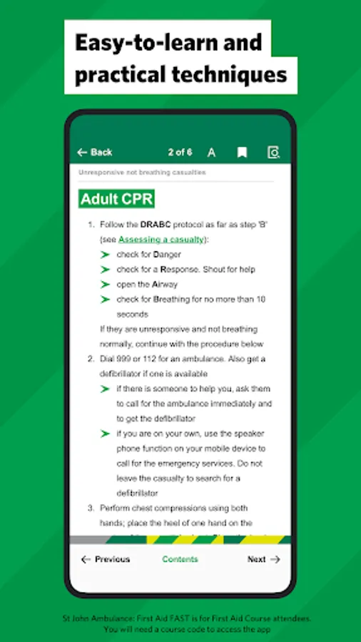 First Aid FAST is an exclusive app available for anyone attending St John Ambulance’s First Aid at Work and Paediatric First Aid courses. Whether you’re an office worker with a colleague who has suffered a cardiac arrest or a scout leader assessing an unresponsive casualty, with First Aid FAST you have reference and reassurance at your fingertips.