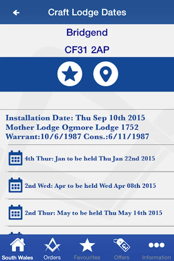 Or you can select your most visited lodges as Favourites and view which of these has meetings that you might want to attend. There will also be a selection of local and regional offers that are available only to users of the app and contact information for the officials of the provinces. All profits made from the sale of the app are going to Masonic charities.