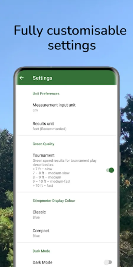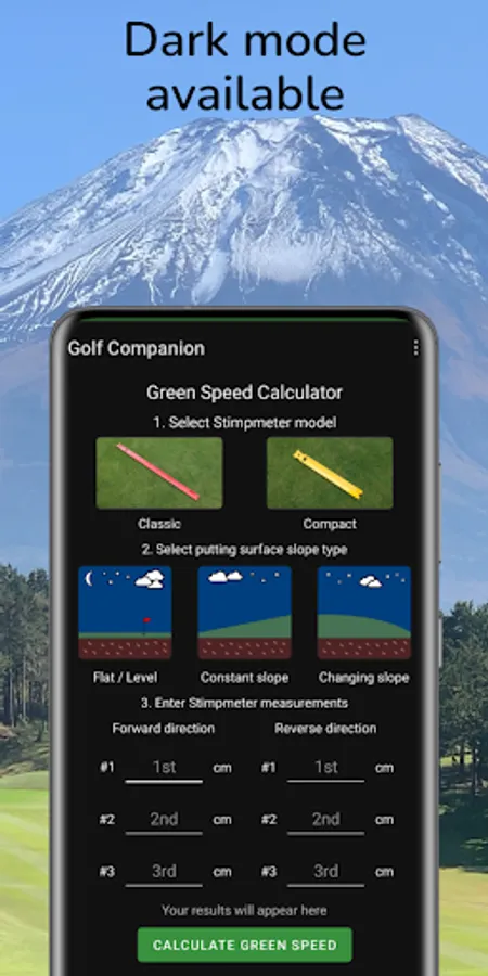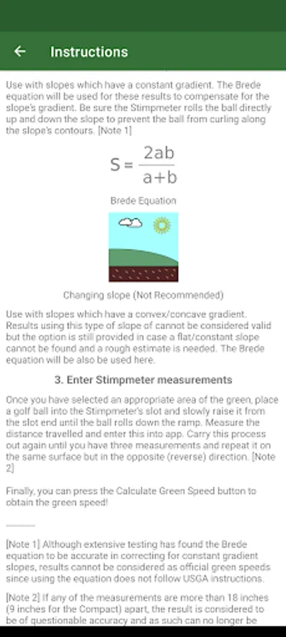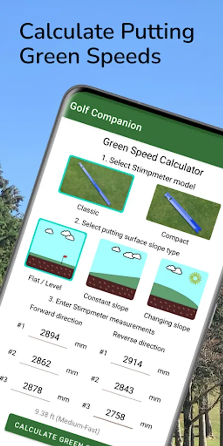 Capable of calculating green speeds for both flat and sloping greens. For flat greens a simple averaging method is used, whereas for sloping greens the Brede equation is employed.