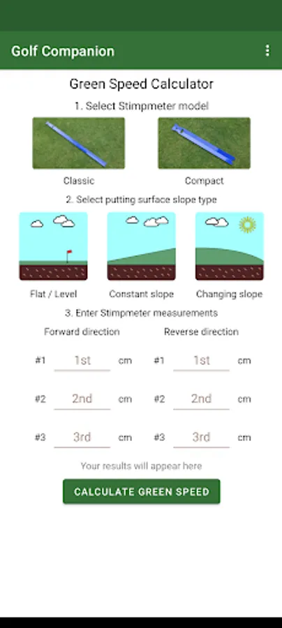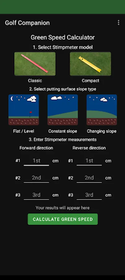 Enter up to three Stimpmeter measurements (in mm, cm, inches or feet) in both directions and the calculator will determine the green speed with a qualitative description.