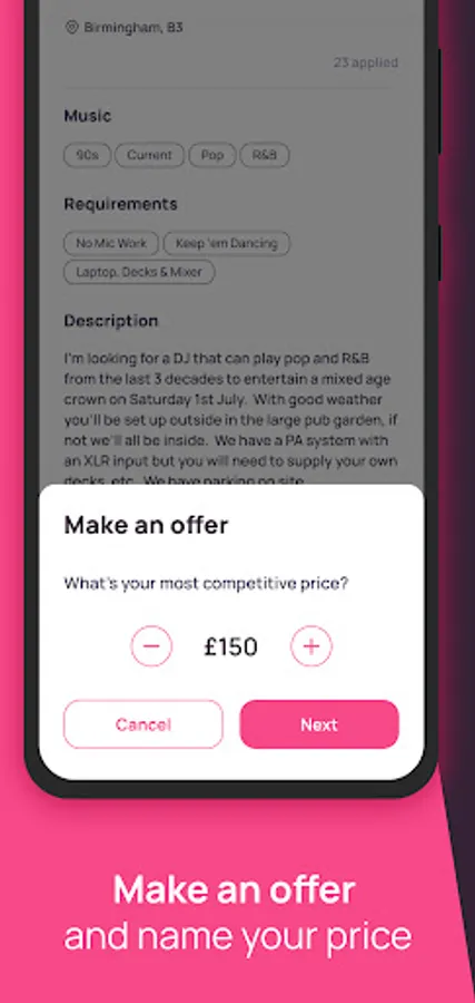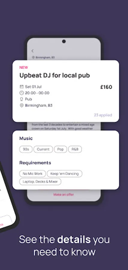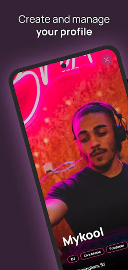 Create your own profile to showcase your professional talents and experience when applying for work. Add your own photos, bio, website, location, and video showcase to put your best self forward. DJs and Live Music acts can add playable top tracks to show off their personality and give an idea what big hits they like to drop.