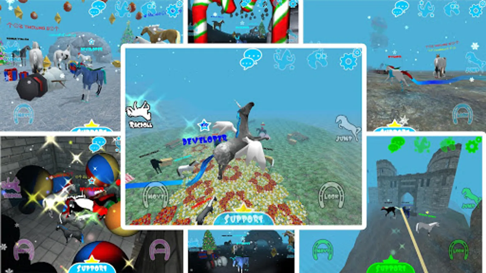 Such as: Dragon and Pegasus wings, Beach ball suit, Wolf masks, Polka dot paints, Zombie, Donkey and Ghost skins, miniature pony and Giant Stallion Horse sizes, Antlers, Sunglasses, Balloons, Unicorn Horns and lots more!