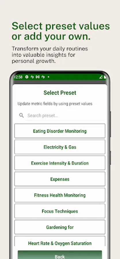 Our app offers a large collection of metric presets that can help you quickly create and track metrics about Mood, Gardening, Work, Health, Activities and many more.