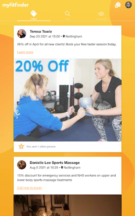 myfitfinder helps you find deals from local fitness businesses, ask questions to the fitness community, and even find a training partner in your area.