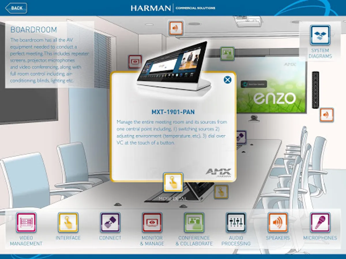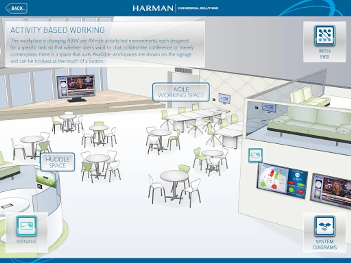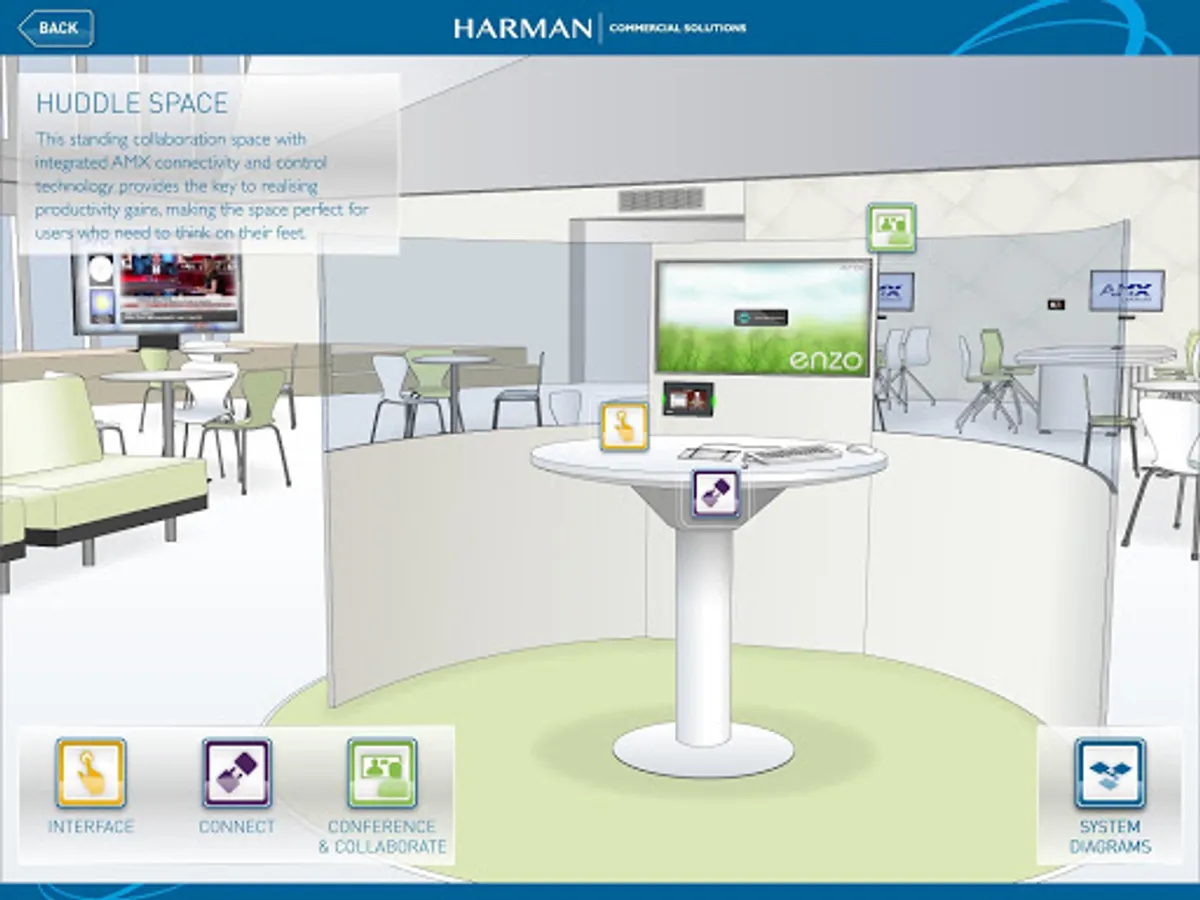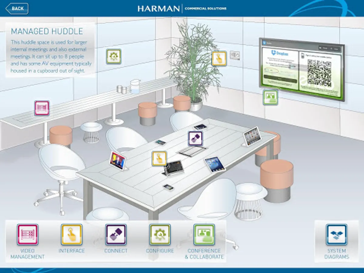 This app lets you explore a virtual office filled with the latest Harman commercial technology. See how easy-to-use touchscreens operate everything from interactive digital signage and environmental controls to room scheduling and video conferencing.