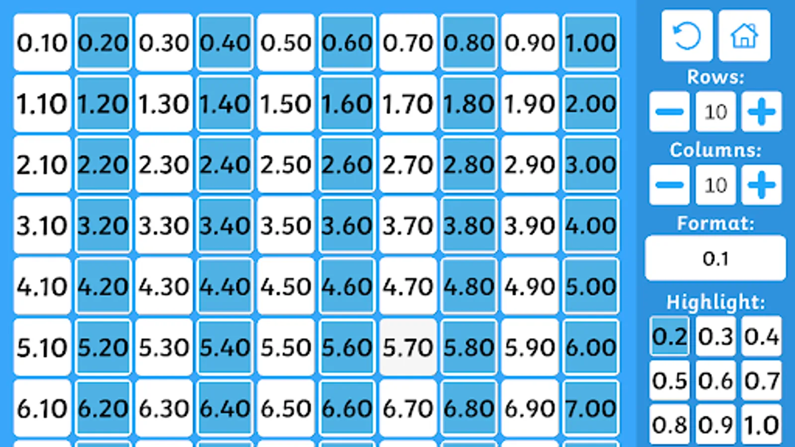 The decimals hundred square challenges children to count in both tenths and hundredths.