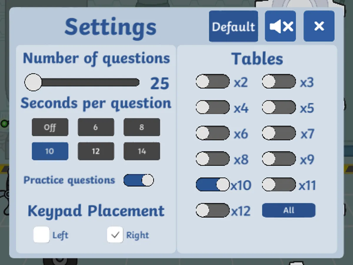 Alternatively, you can use the default setting which follows the exact format of the MTC - 25 questions with children given 6 seconds per question and 3 seconds in between.