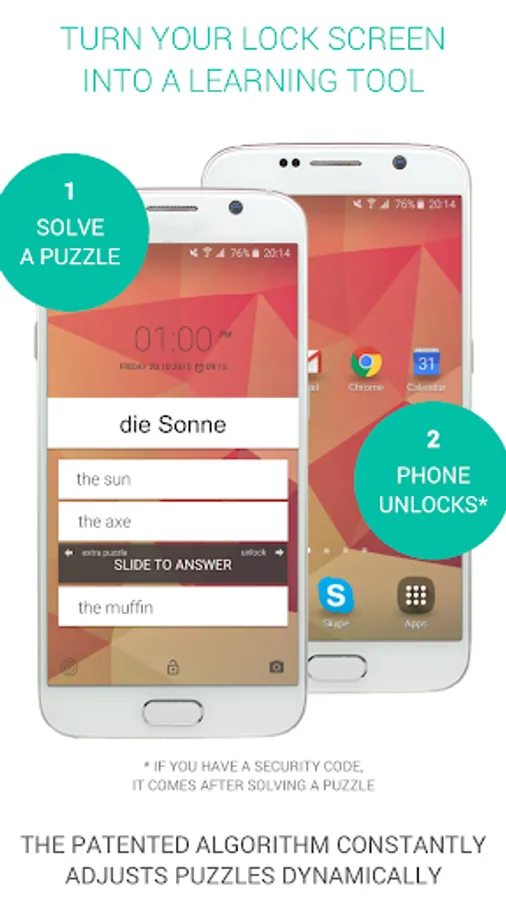 Semper uses natural breaks in your flow, like when you unlock your phone or while you wait for an app to load. This makes it comfortable, while relieving you of having to schedule time for memorizing vocabulary. Semper uses an adaptive algorithm, that optimizes item repetition and puzzle difficulty to maximize learning efficiency for each user.