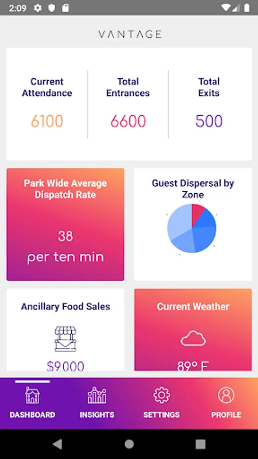 This application allows entertainment and hospitality staff to easily view metrics relating to the real-time status of their venue in order to maximize efficiency, safety and guest experience. Available metrics include (but are not limited to) wait times, current weather data and guest dispersal. This app will work in seamless conjunction with a centralized web application portal customized for venue management, as well as a guest-facing mobile application.