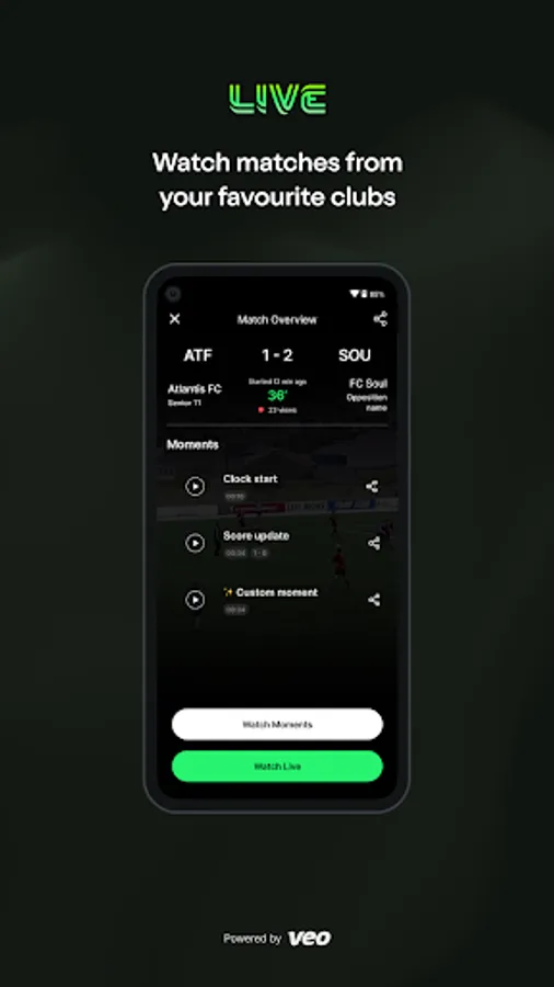 When a club live-streams using a Veo camera, their followers receive a notification which will take them straight to the action in the Live App.