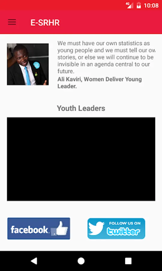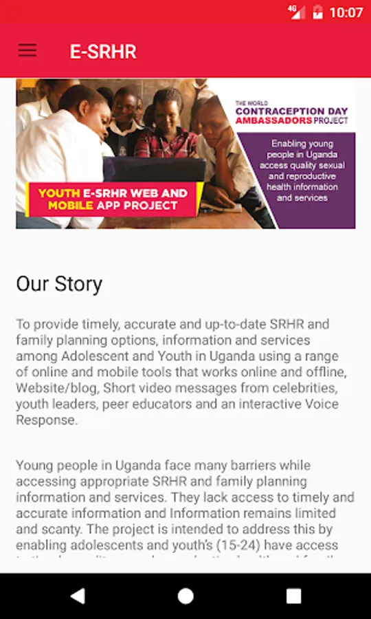 The eSRHR App is one of the tools aimed at providing timely, accurate and up-to-date Sexual and Reproductive Health Rights and Family Planning Information & Services among Adolescent and Youths as its primary targets. The App allow users to access information from the project website and listen to live discussions aired on the website.
