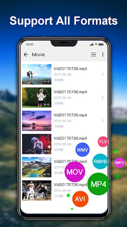 Video player supports almost all video formats including AVI, MP4, WMV, RMVB, MKV, 3GP, M4V, MOV, TS, MPG, FLV, etc, depending on your device's decoder.