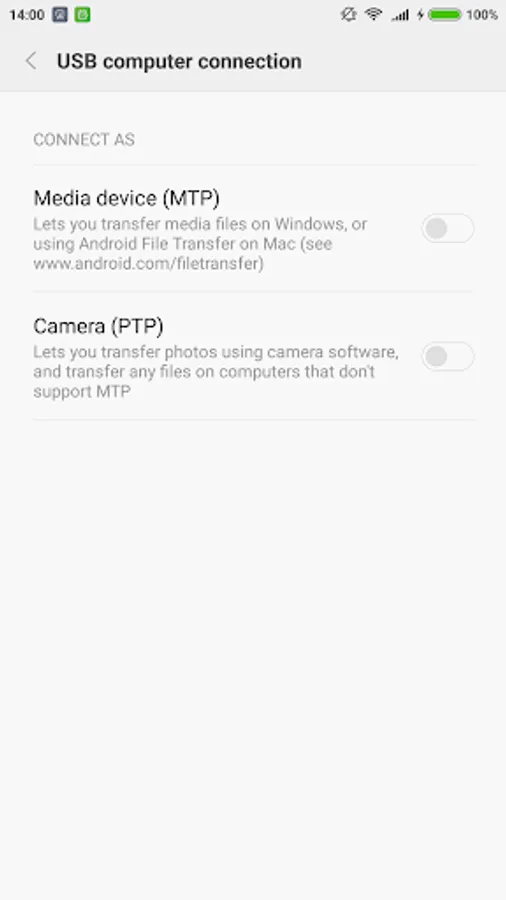 After turning off both MTP and PTP connections from the notification bar drop down menu and reconnecting the device to the PC, this menu does not appear anymore. Since both MTP and PTP are turned off, the PC doesn't see the device. MTP and PTP can't be turned back, since USB connection settings are not accessible from the phone's Settings.