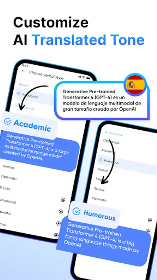 - Customize translation style based on the context: academic, funny, formal, serious,...