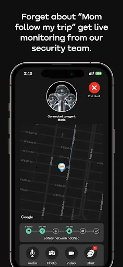 Live monitoring: You can request our security team to monitor your live location, audio, and video, to make sure you are always safe and protected. In case of an emergency, they can provide immediate assistance, alert other verified helper users, call 911, and more.