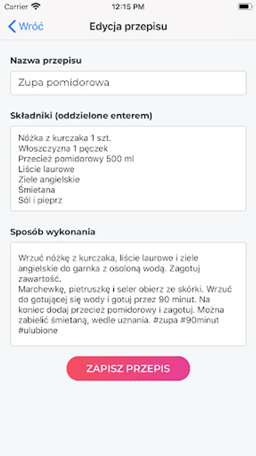 Add your favorite recipes in the application. Complete them with the necessary ingredients and #hashtags to be able to easily search one by one.