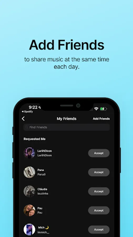 1. At a random time each day, a notification will prompt you and your friends to share your most recently played song and a message all at the same time.