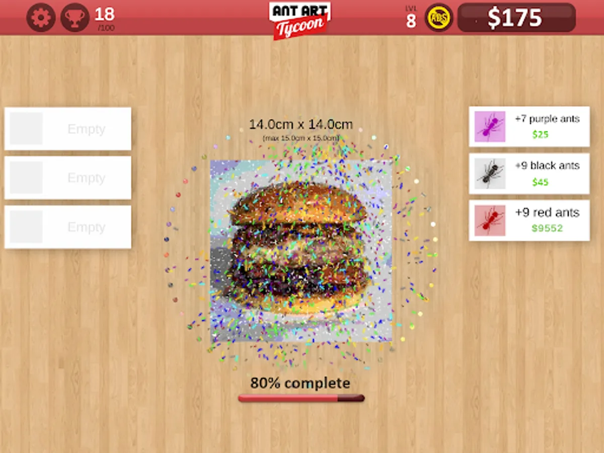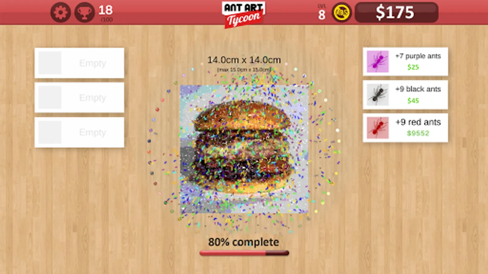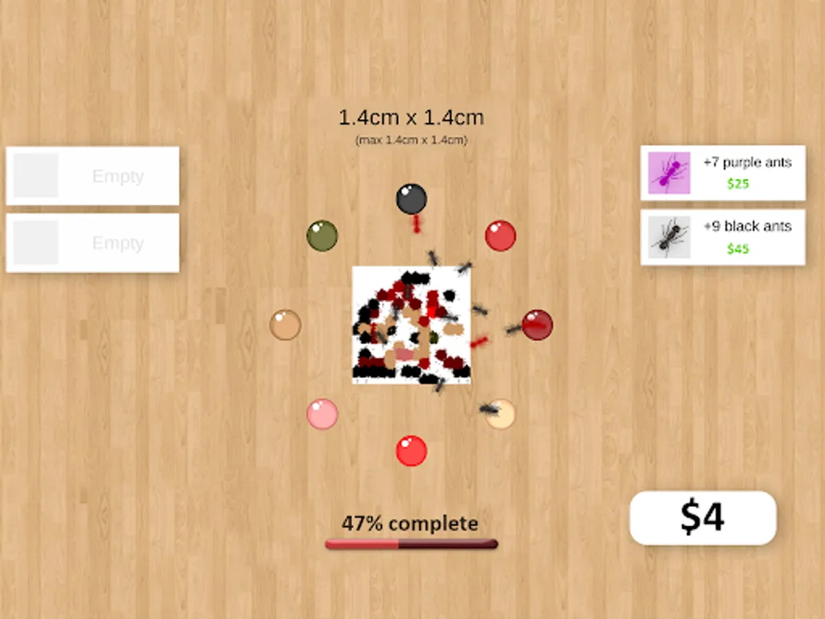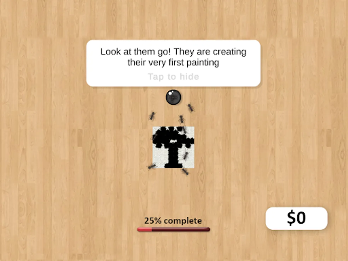 Tap to grow your ant colony by buying bigger and faster ants, and watch proudly as they create better and better artwork before your very eyes. Click and tap to build an army of ants making beautiful art work. Before you know it you'll have hundreds of ants creating new art in seconds.
