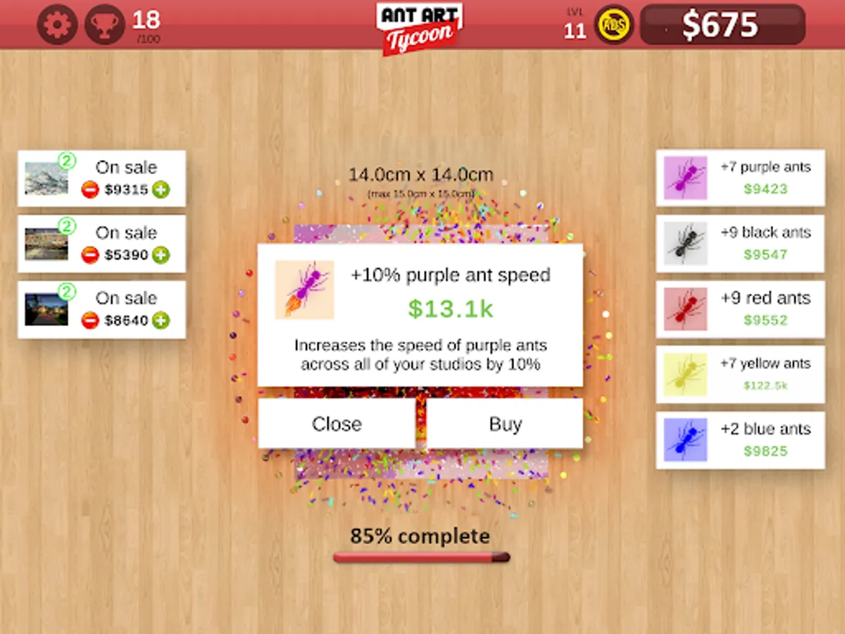 Tap to make money and get more ants to level up! Upgrade your ants' art skills and get your name out into the art world to become a tycoon in your new favorite idle clicker tycoon game. Play one of the most unique idle clicker games in the Google Play Store!