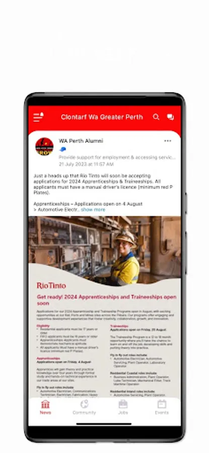 The Clontarf App is designed to Empower our community through Mentoring. It connects Clontarf graduates with Clontarf alumni who become mentors and role models within our community. The app is also a place for you to stay up to date with Clontarf news, job opportunities and events.