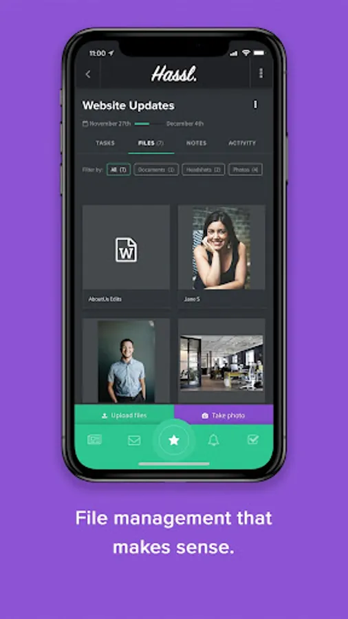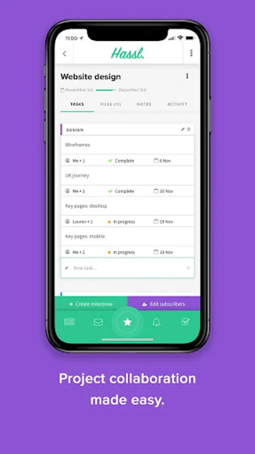 * File management that makes sense - With Hassl, there's no more digging through email chains. All your files are safely stored between projects, organised by tags and ready to be searched. And with intuitive version control, you can say goodbye to duplicate files.