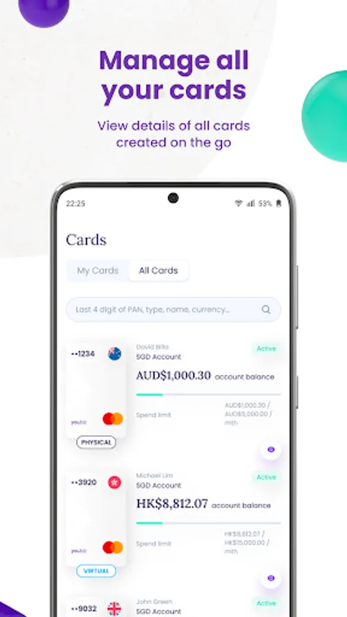 • Unlimited virtual & physical corporate cards to organise different expenses