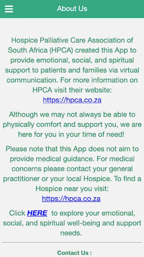 Hospice Palliative Care Association of South Africa (HPCA) created this App to provide emotional, social, and spiritual support to patients and families via virtual communication. For more information on HPCA visit their website: https://hpca.co.za