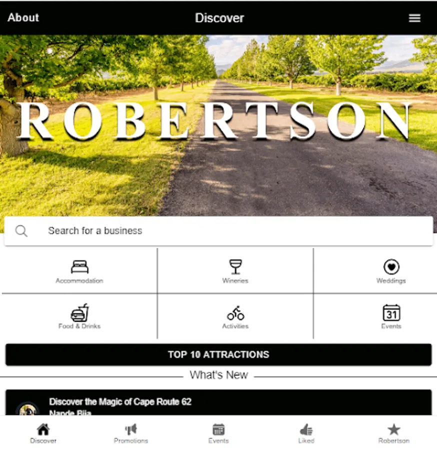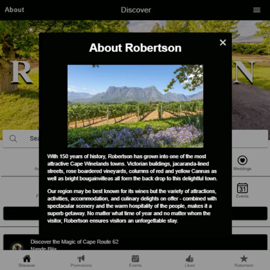 With 150 years of history, Robertson has grown into one of the most attractive Cape Winelands towns. Victorian buildings, jacaranda-lined streets, rose boarded vineyards, columns of red and yellow cannas as well as bright bougainvilleas all form the backdrop to this delightful town. Our region may be best known for its wines but the variety of attractions, activities, accommodation, and culinary delights on offer - combined with spectacular scenery and the warm hospitality of the people, makes it a superb getaway.