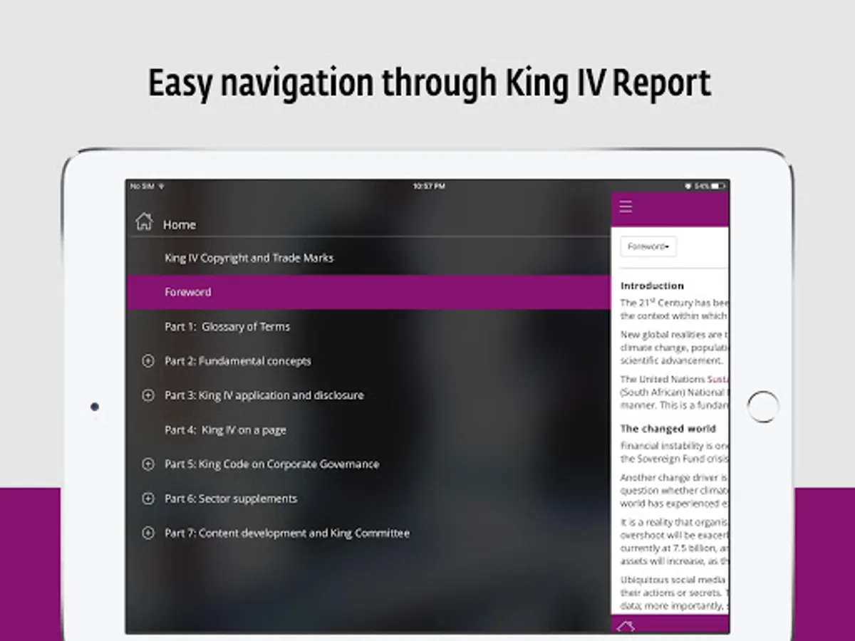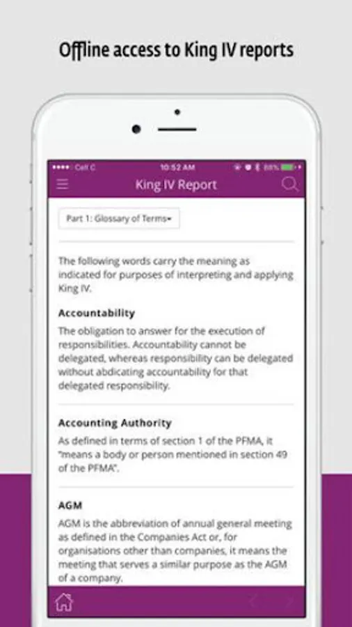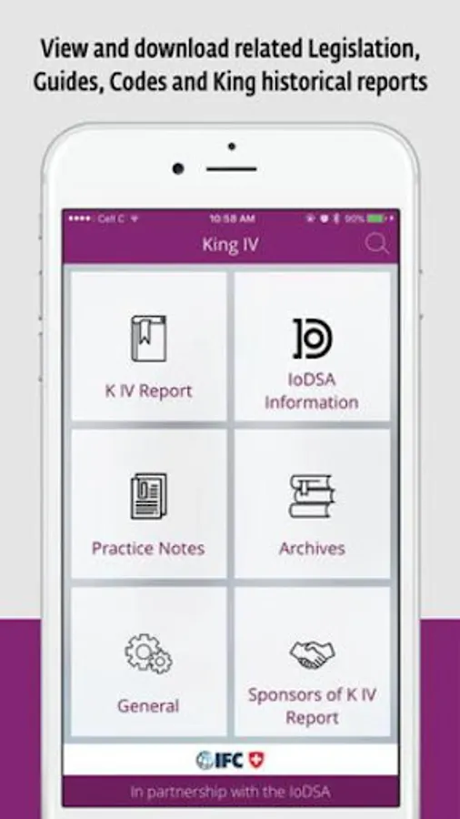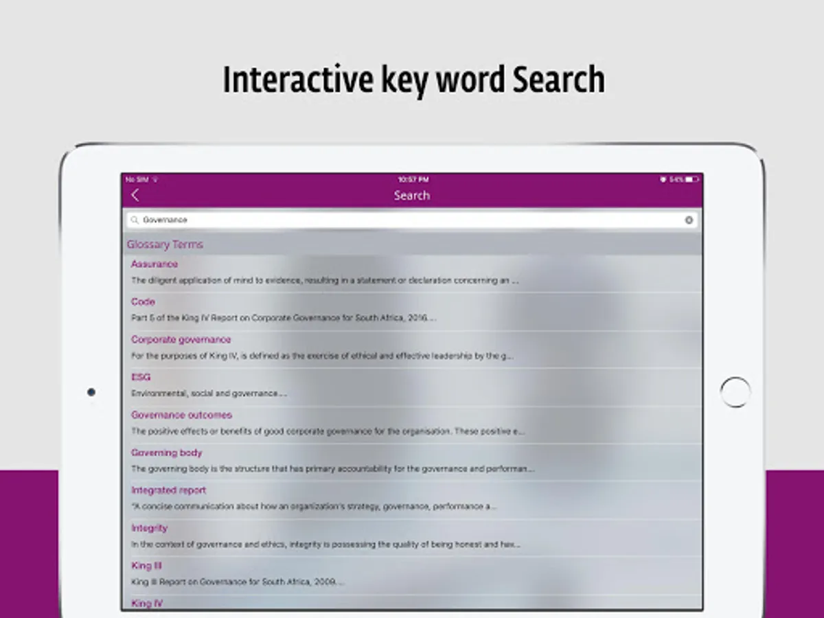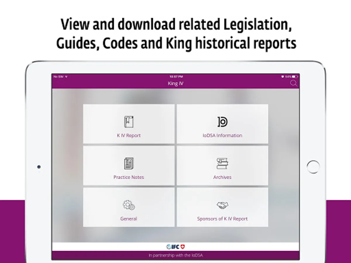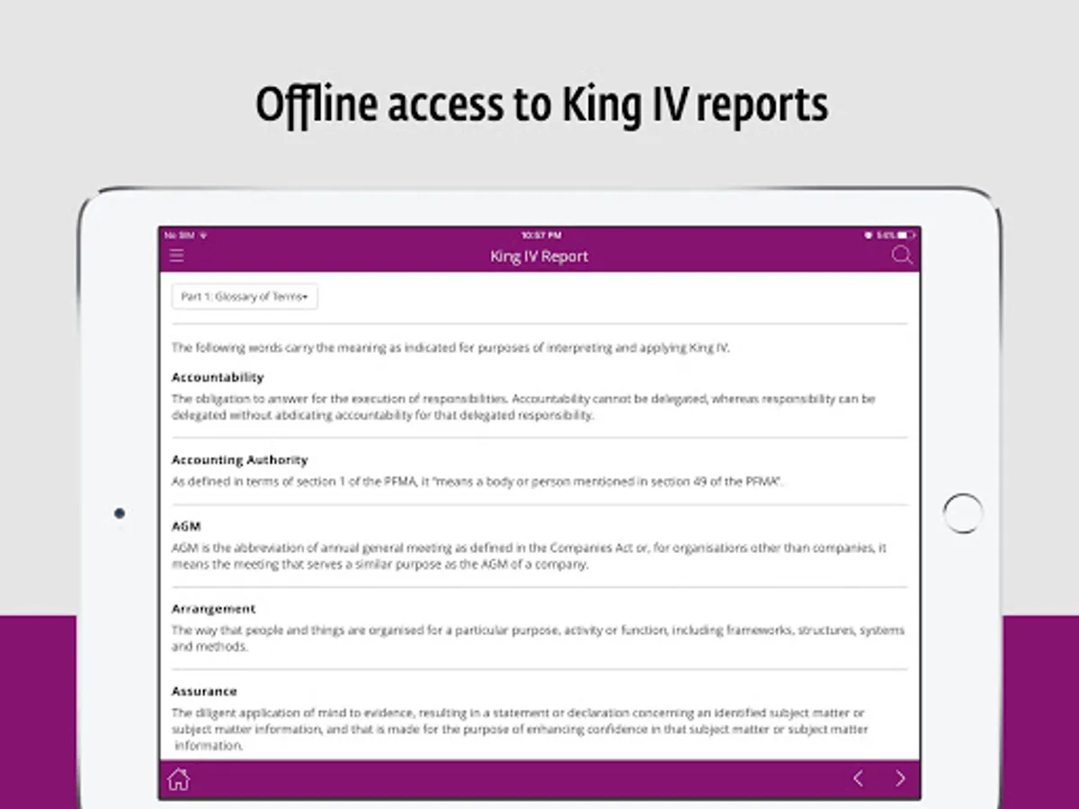 The King IV Report app gives you easy access to the entire King IV Report on Governance in South Africa, 2016 including the sector supplements. Search functionality makes access to governance best practice easier. Also included in the app are the relevant acts, codes and guidelines referred to in King IV as well as historical King reports, namely King I, II and III. No more carrying around text books to know what the roles and responsibilities of governing bodies are. Every person tasked with governance duties should have this app.