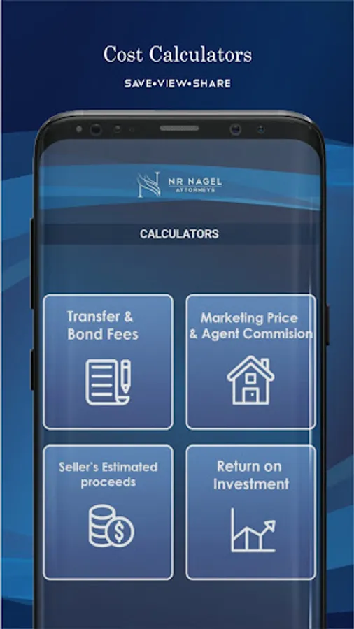 Calculators: Transfer and Bond Cost calculator, Marketing Price, Commission and percentage of lower offer received calculator, Seller’s Proceeds calculator and Return on Investment Calculator. All results can be viewed, saved in PDF and shared via Email, WhatsApp and other platforms.