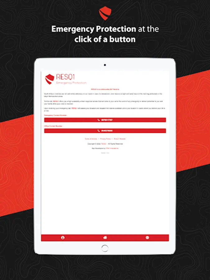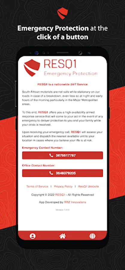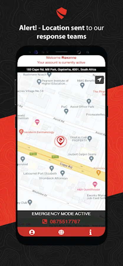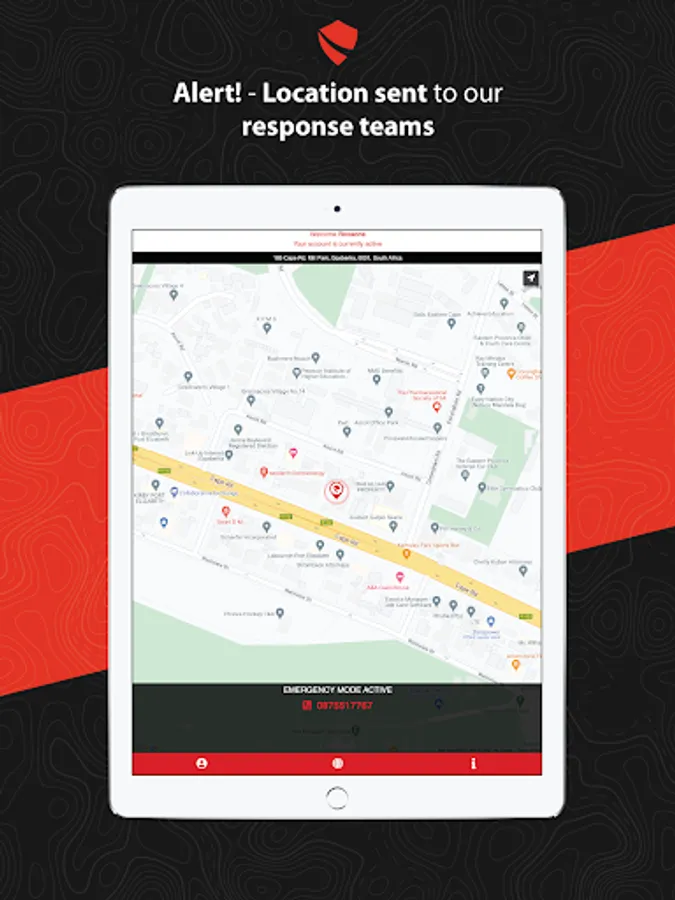 In the case of a road side emergency the app will get the users location send it to the emergency service call centre and place a call connecting the user to the call centre. Armed response will be sent to the users location and offer support on arrival.