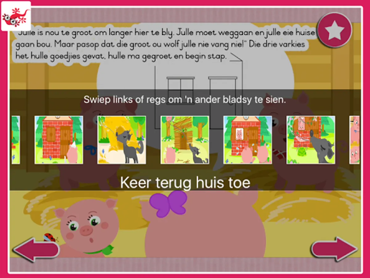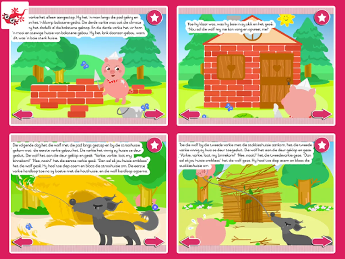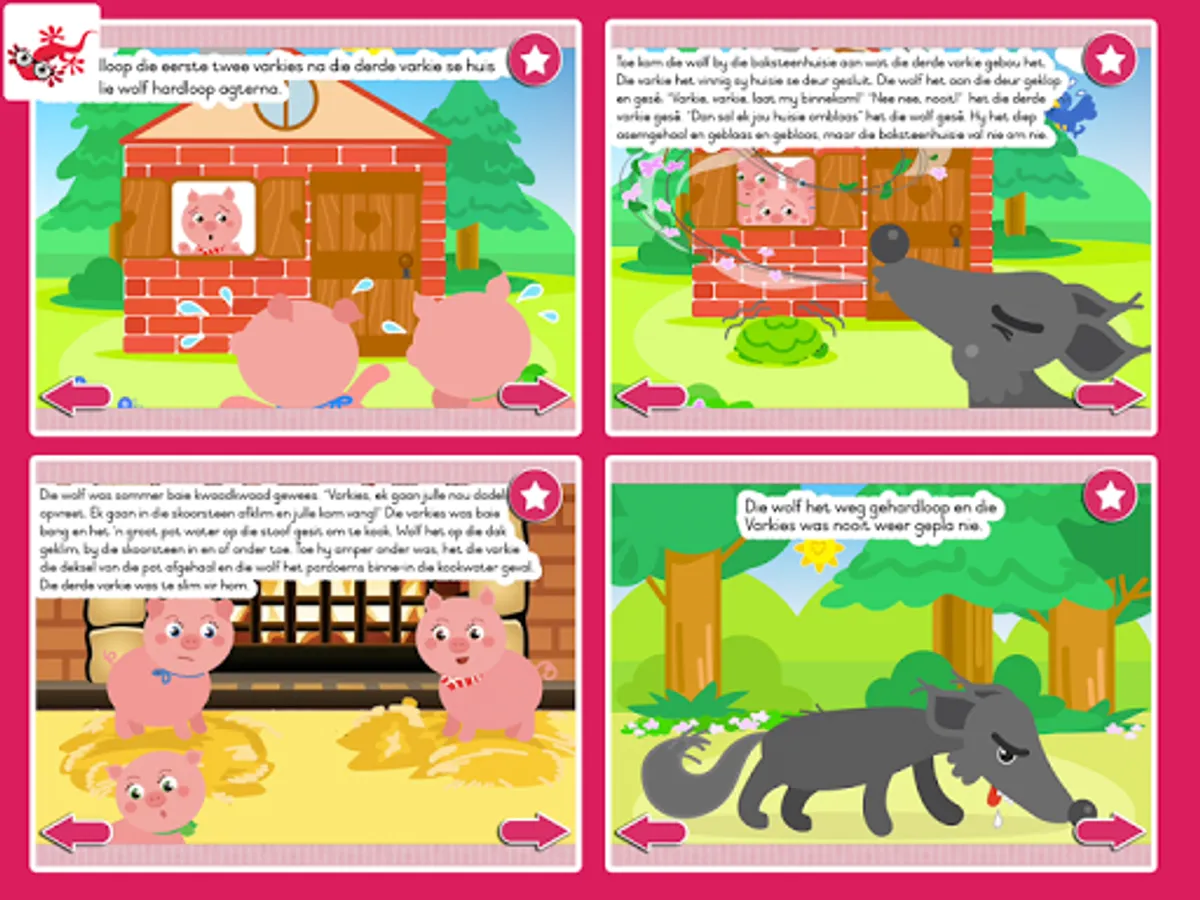 The three little pigs children's story in Afrikaans with colorful large illustrations, simple text, this is the perfect fairy tale series for preschoolers. Irritable small team's imaginations by little story aloud for them to read. The story can be read to you by a professional voice artist.