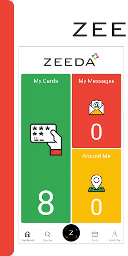 The Dashboard is the landing page of the app. It contains a quick access to the Cards, the Around Me and the Message Center in which the user will receive all notifications received from ZEEDA.