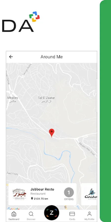The Around Me feature on the dashboard shows all shops around the user to choose from. It shows as well, while dragging, the shops location on the map with shop category, distance and offers available on each shop.
