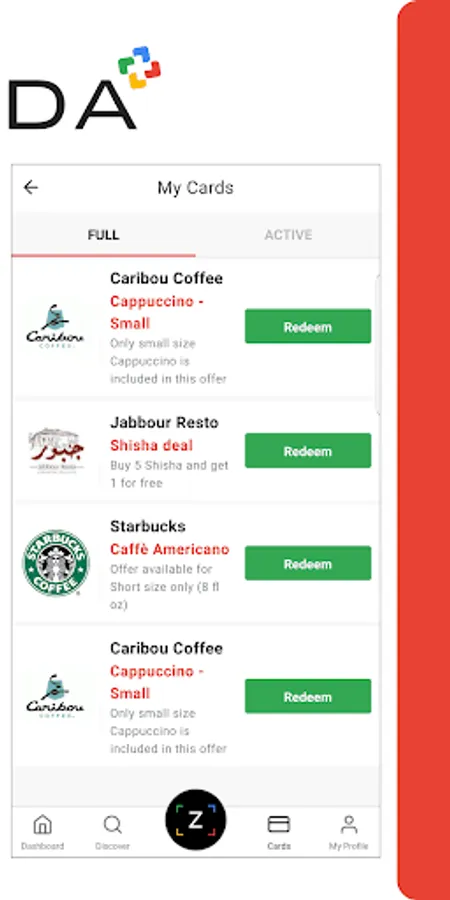 The Cards feature contains the filled cards that already contains a free item to redeem and the open cards that contains stamps but aren’t completed yet. The user can redeem free items from the Full Cards feature.