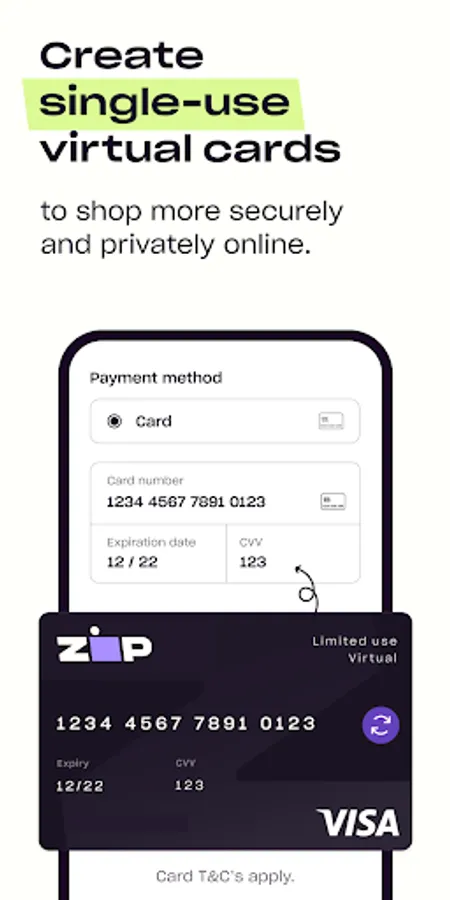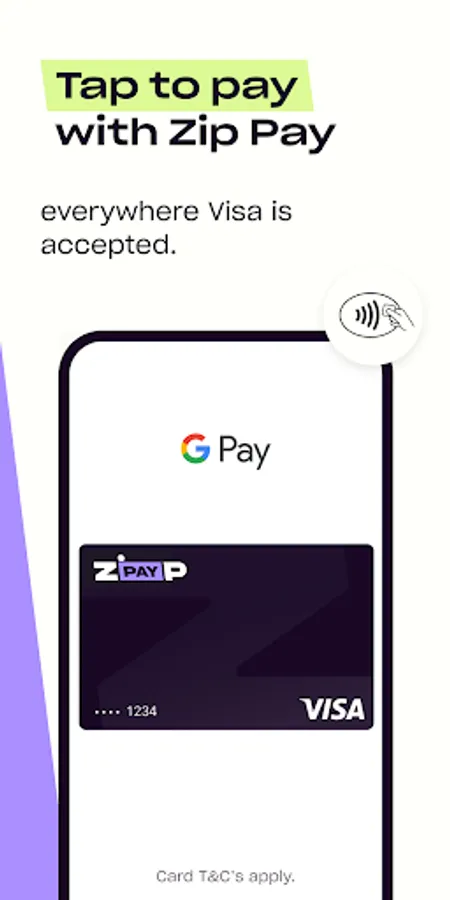 4 - Tap to pay with Zip Pay only. Use the Card everywhere Visa contactless payments are accepted. Use virtual card everywhere Visa is accepted online. Card T&Cs apply