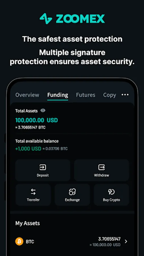 Security is our top priority. ZOOMEX uses a multi-signature cold/hot wallet system as a financial asset protection system.