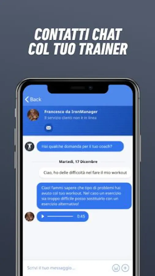 The official IronManager app. Personalized training programs with exercises selected one by one based on your goal. Direct contact with your trainer through internal chat.