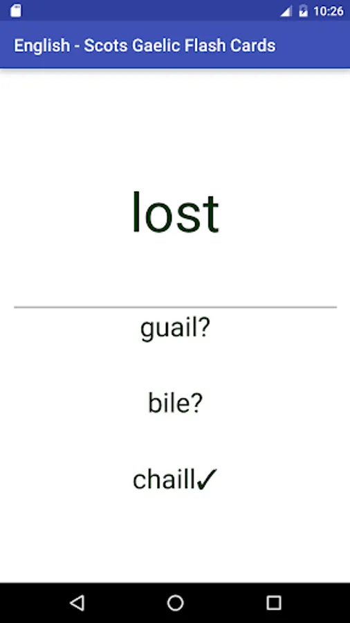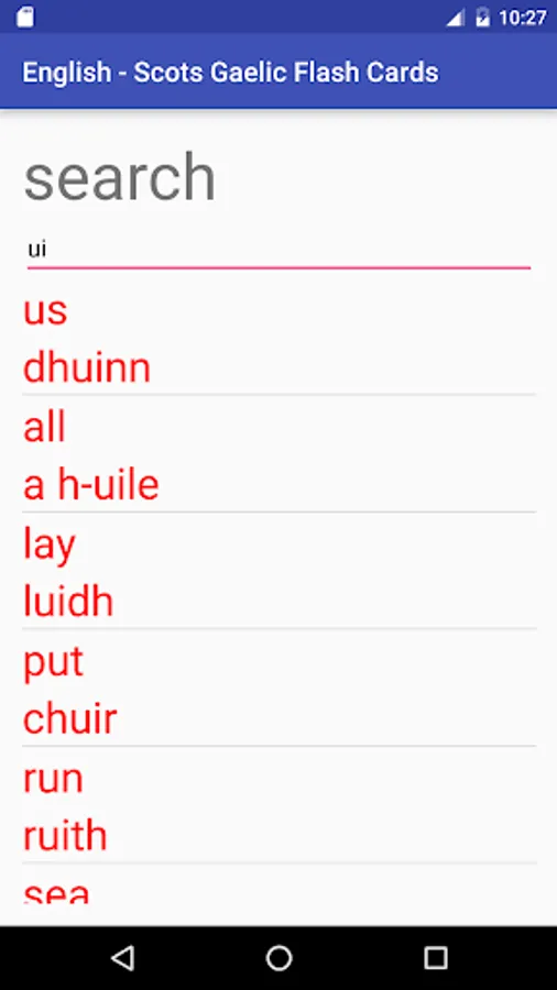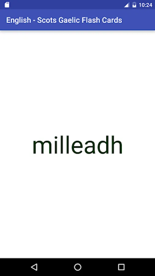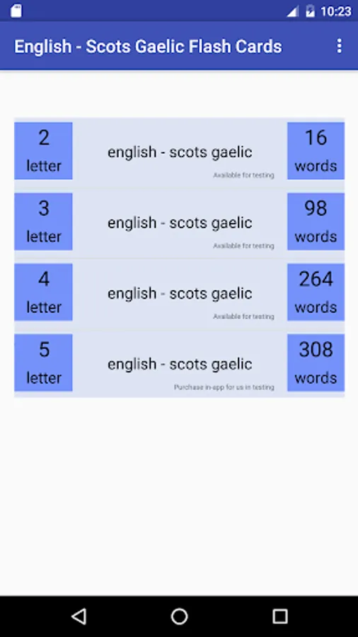 A tiny app that helps you along with learning the basics of Scots Gaelic. Containing 1, 2, 3, 4 and 5 letter English words translated to Scots Gaelic. Also available are search facilities (free), a shuffle mode (free) to randomise cards as well as a test mode (in-app paid for).